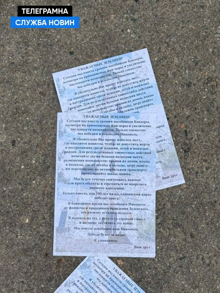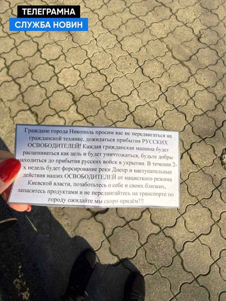 У Нікопольській районній військовій адміністрації закликали громадян не піддаватися на провокації, не поширювати зміст листівок і орієнтуватися виключно на офіційні джерела повідомлень.