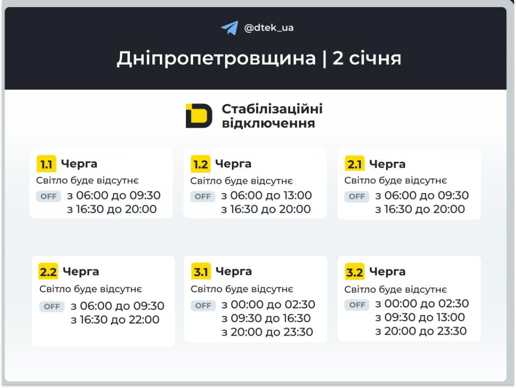 За інформацією ДТЕК, відключення стосуватимуться всіх черг споживачів. Для підчерги 6.2 передбачено чотири відключення на добу, а для інших підчерг — від двох до трьох разів на добу.