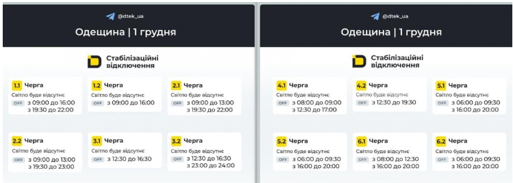 На сьогодні вже є офіційні графіки відключень електроенергії для Одеської області саме на 1 грудня 2025 року.