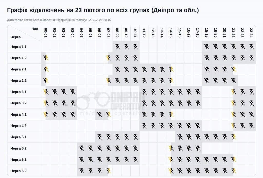Станом на 23 лютого енергетики регіону орієнтуються на погодинні графіки відключень, які формуються відповідно до вказівок оператора системи передачі та доводяться до споживачів через офіційні канали обленерго. Йдеться не про повну відсутність електроенергії протягом доби, а про кероване обмеження споживання у визначені проміжки часу з метою балансування системи.
